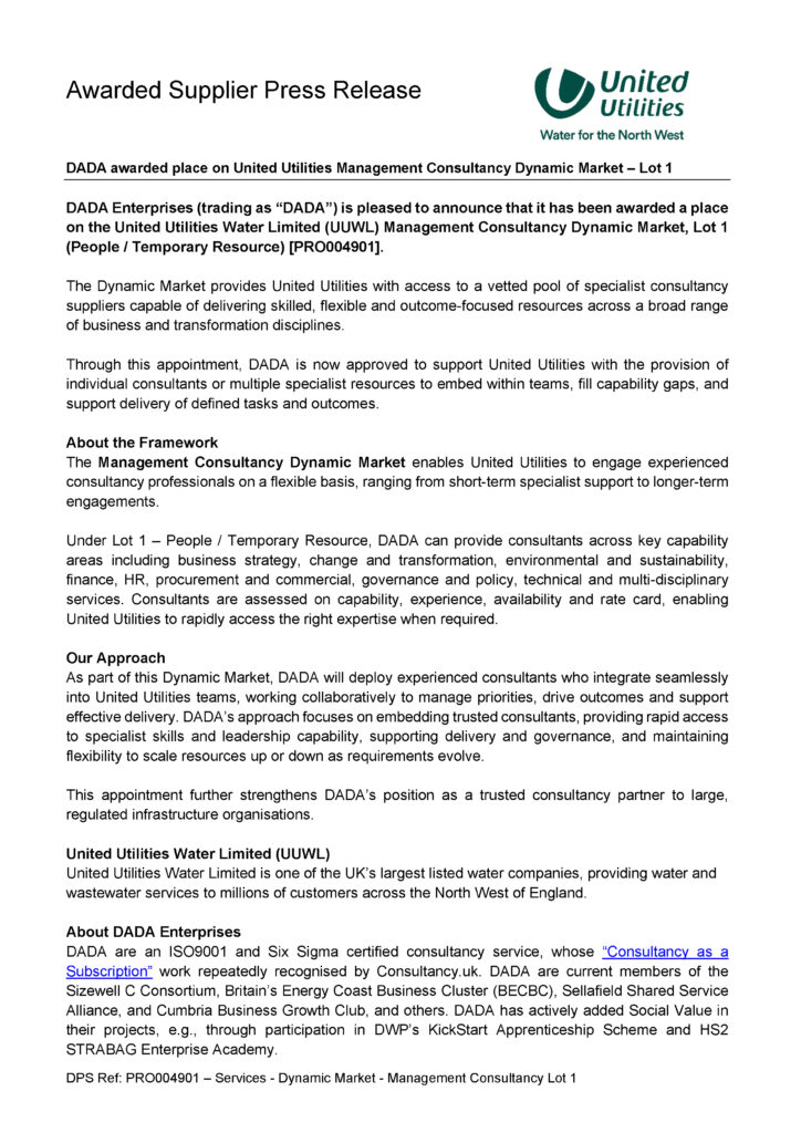 DADA Enterprises (trading as “DADA”) is pleased to announce that we have been awarded a place on the United Utilities Management Consultancy Dynamic Market, under Lot 1 – People / Temporary Resource.